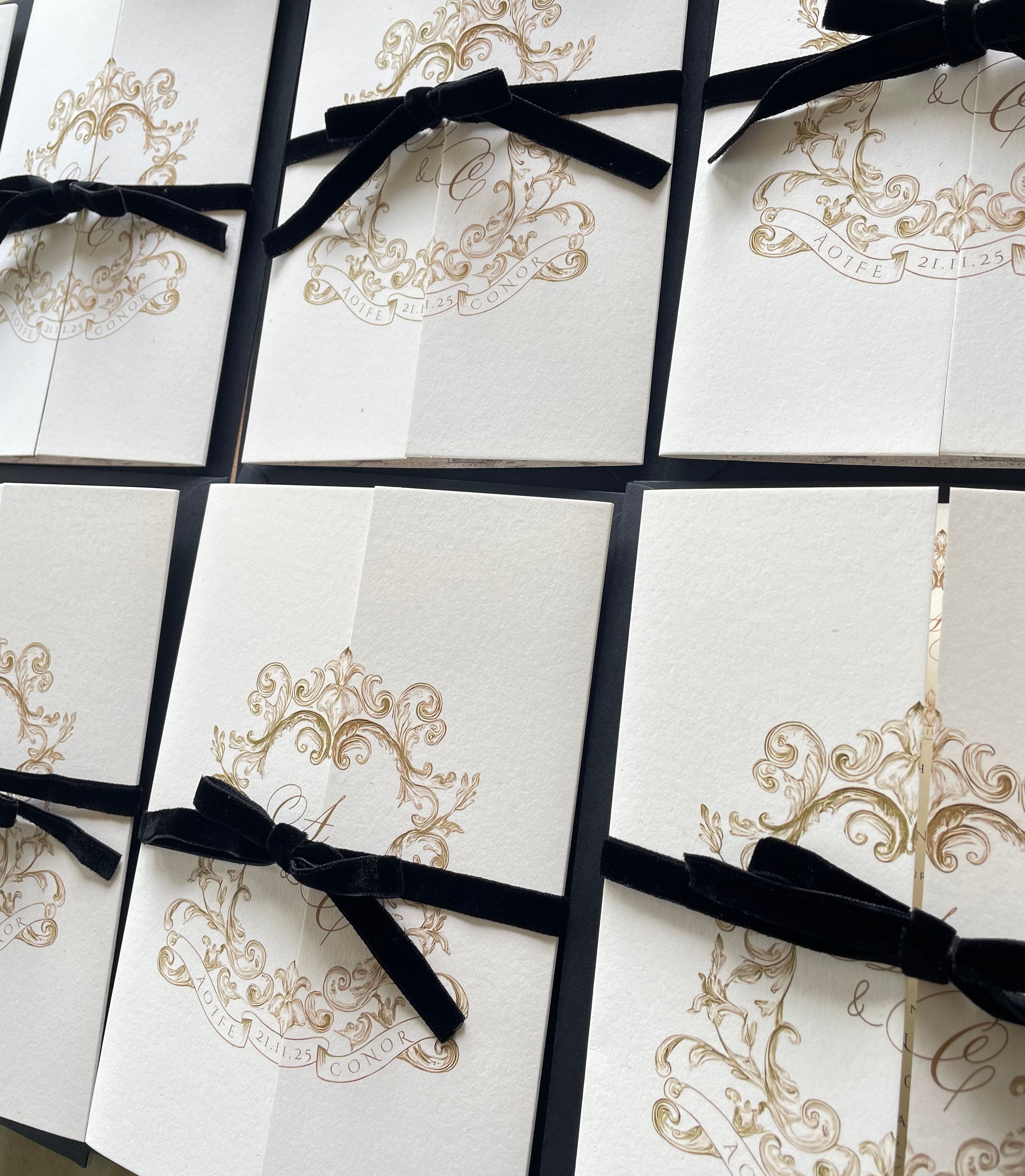 Featuring a delicately illustrated crest intertwined with your initials, this gatefold-style invitation is printed on premium textured ivory cardstock and wrapped in a rich black velvet ribbon for an extra touch of opulence. Gold scrollwork lends a regal, heritage-inspired feel, making it ideal for formal weddings in stately venues or castle settings, or a black tie wedding.