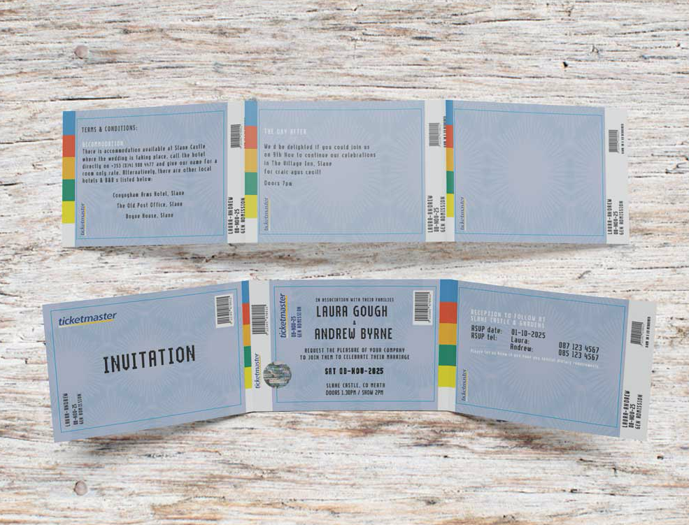 Featuring authentic details such as barcodes, perforated sections, and bold typography, this design unfolds to reveal all the essential wedding information in a stylish, easy-to-read layout. From the main “event” details to RSVP and accommodation information, every panel is thoughtfully arranged to mimic a genuine ticket experience.