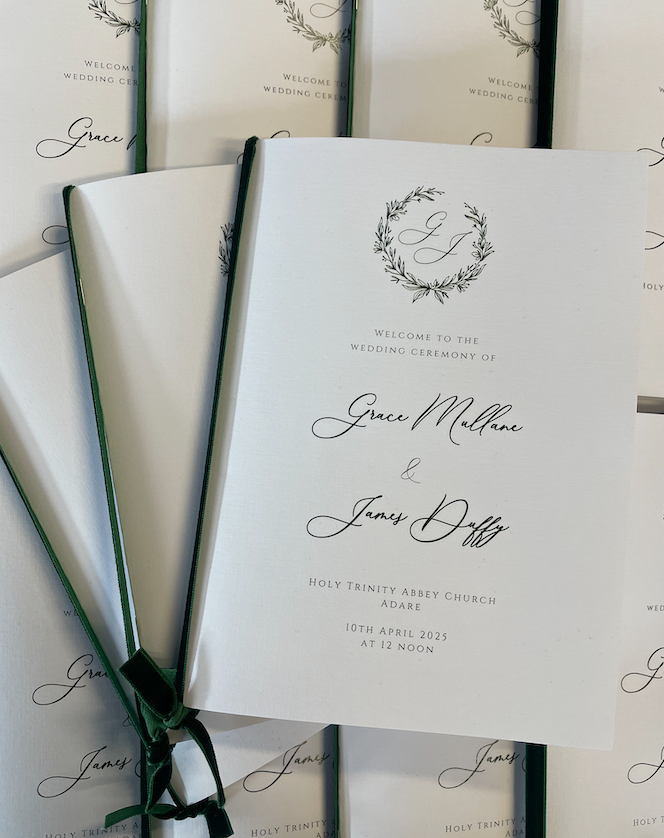 Celebrate your special day with this beautifully crafted wedding mass booklet, designed to complement a timeless and romantic ceremony. Featuring a minimalist white cover with forest green botanical wreath detailing and the couple’s monogram, this booklet adds a personal and elegant touch to your nuptials.