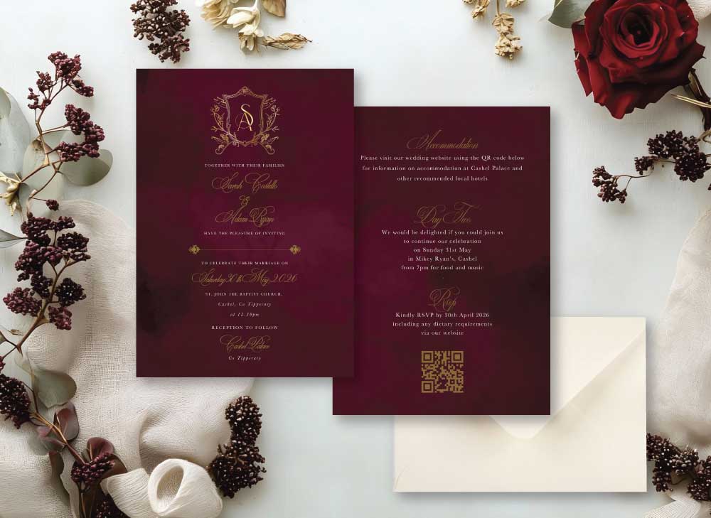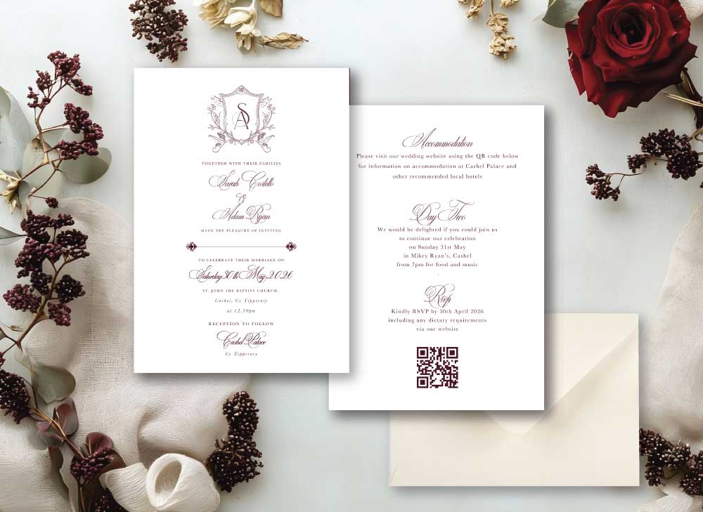 The layered design balances tradition with modern refinement, making it ideal for any couple searching for a luxury burgundy design. Thoughtful details, from the refined hierarchy of text to the discreet QR code on the details card, ensure both beauty and practicality, allowing guests to access accommodation and RSVP information seamlessly.