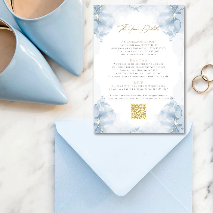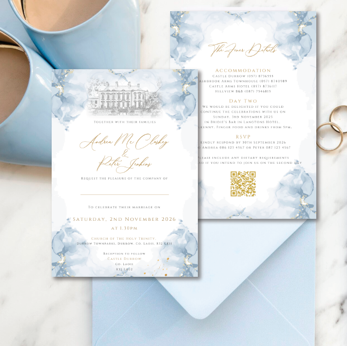 This stunning wedding invitation features a soft dusty blue watercolour design and venue illustration, creating a dreamy, ethereal border. Delicate washes of blue are accented with subtle hints of gold, adding warmth and a touch of understated luxury.
