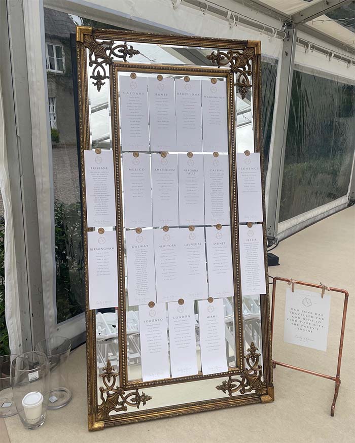 Wedding table plan cards are designed to be displayed at your venue on a mirror or frame, elegantly finished with a wax seal at the top of each card.