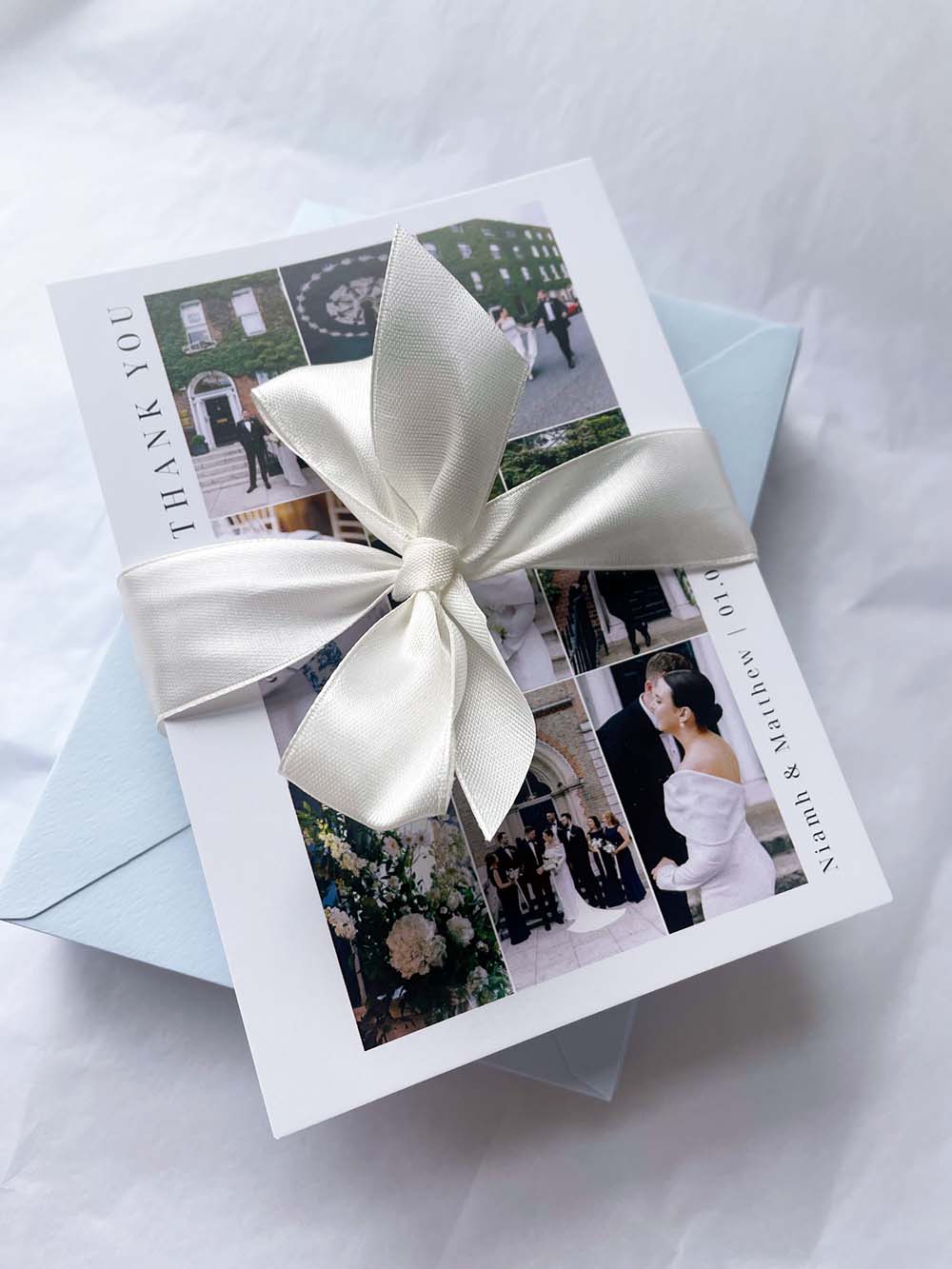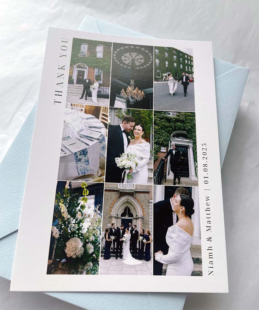 Say thank you to your wedding guests with a personalised wedding thank you card. Include a collage of your favourite photos from your big day, add a personal message on the reverse of the card and let your guests know you enjoyed their company on your wedding day! Our wedding thank you cards are printed in full colour on quality card for a look and feel befitting your nuptial celebrations. Thank you cards are available in a range of quantities to suit your wedding guest list and supplied with matching cream envelopes. Just upload your image and add the text content you would like to include when ordering.