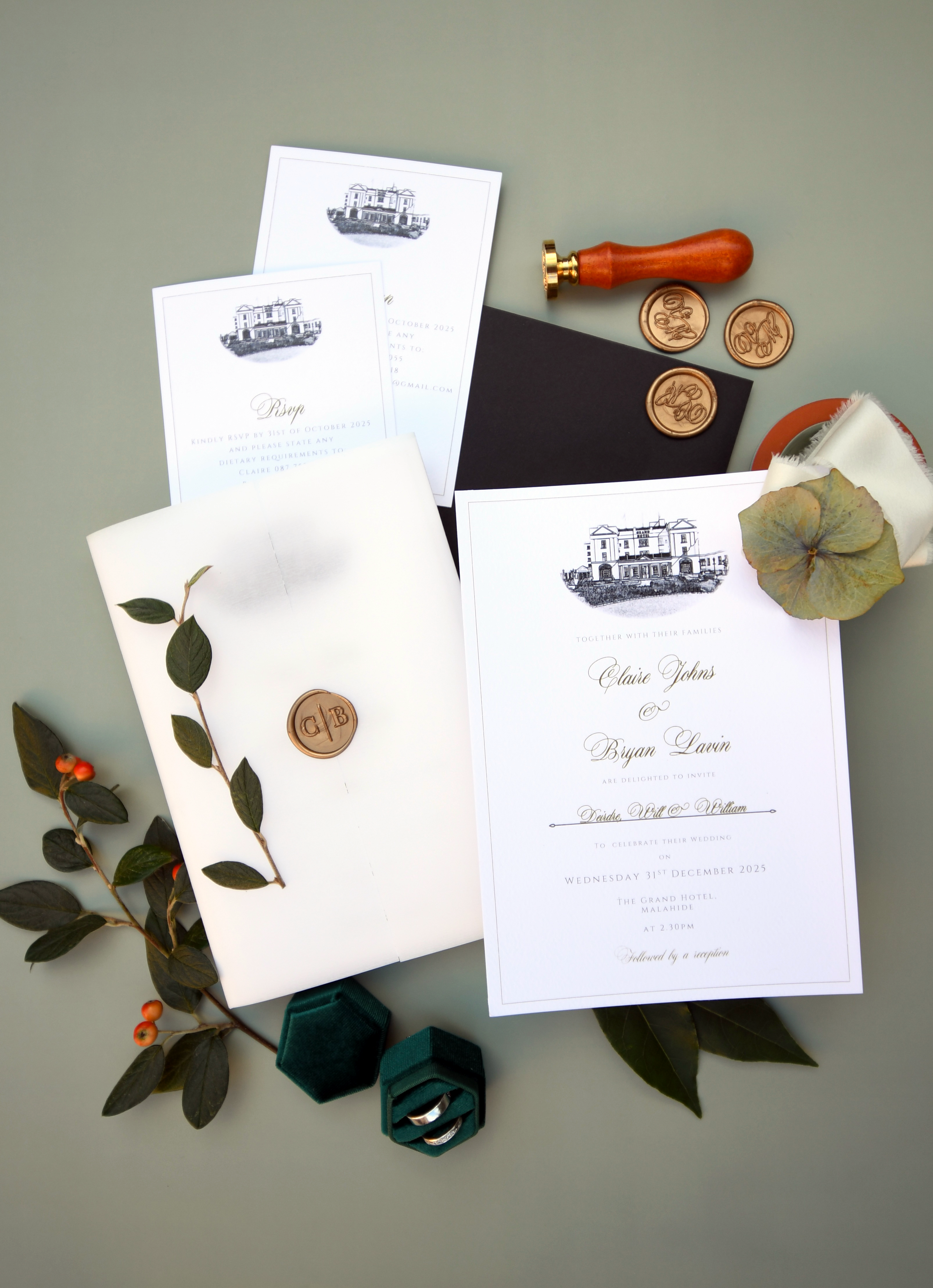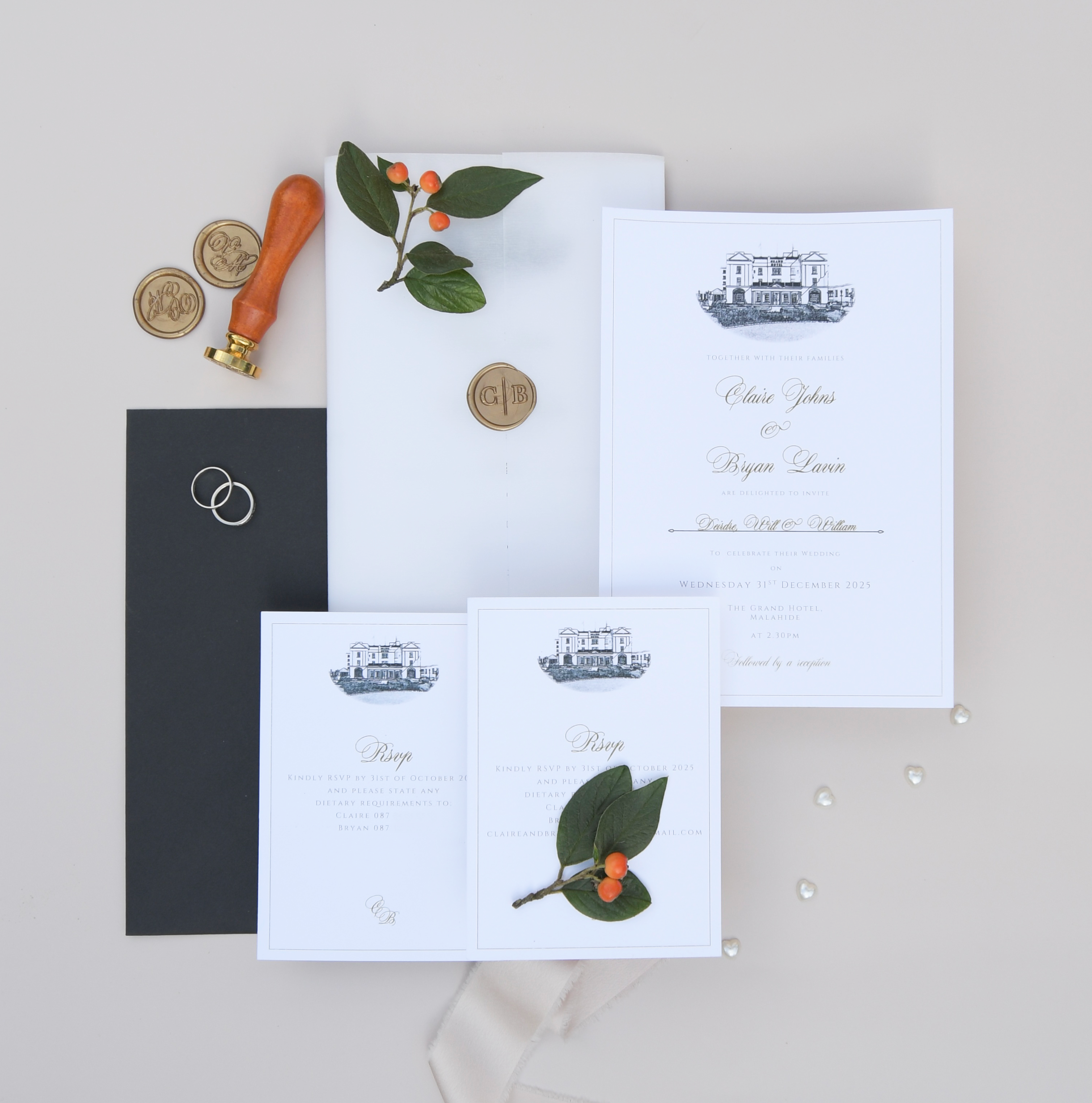 Our Wedding Venue Illustration packages are printed on highest quality, brilliant-white linen board and include A5 invitations, matching RSVP’s, Wax Seals and Envelopes.